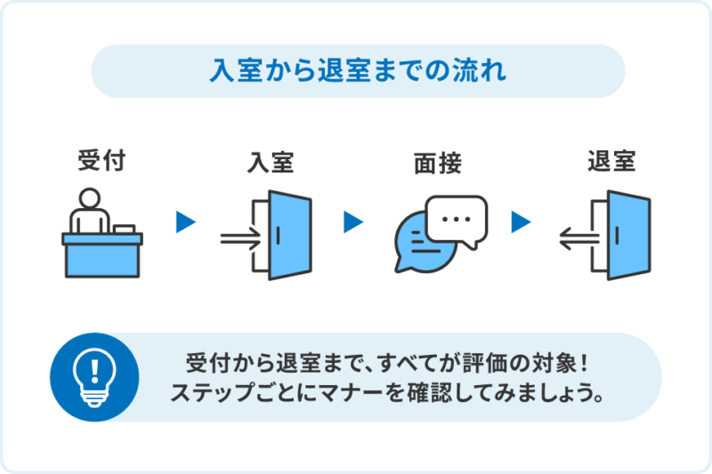 受付から退室まで、すべてが評価の対象です。ここでは、各ステップでのマナーを確認しましょう。
