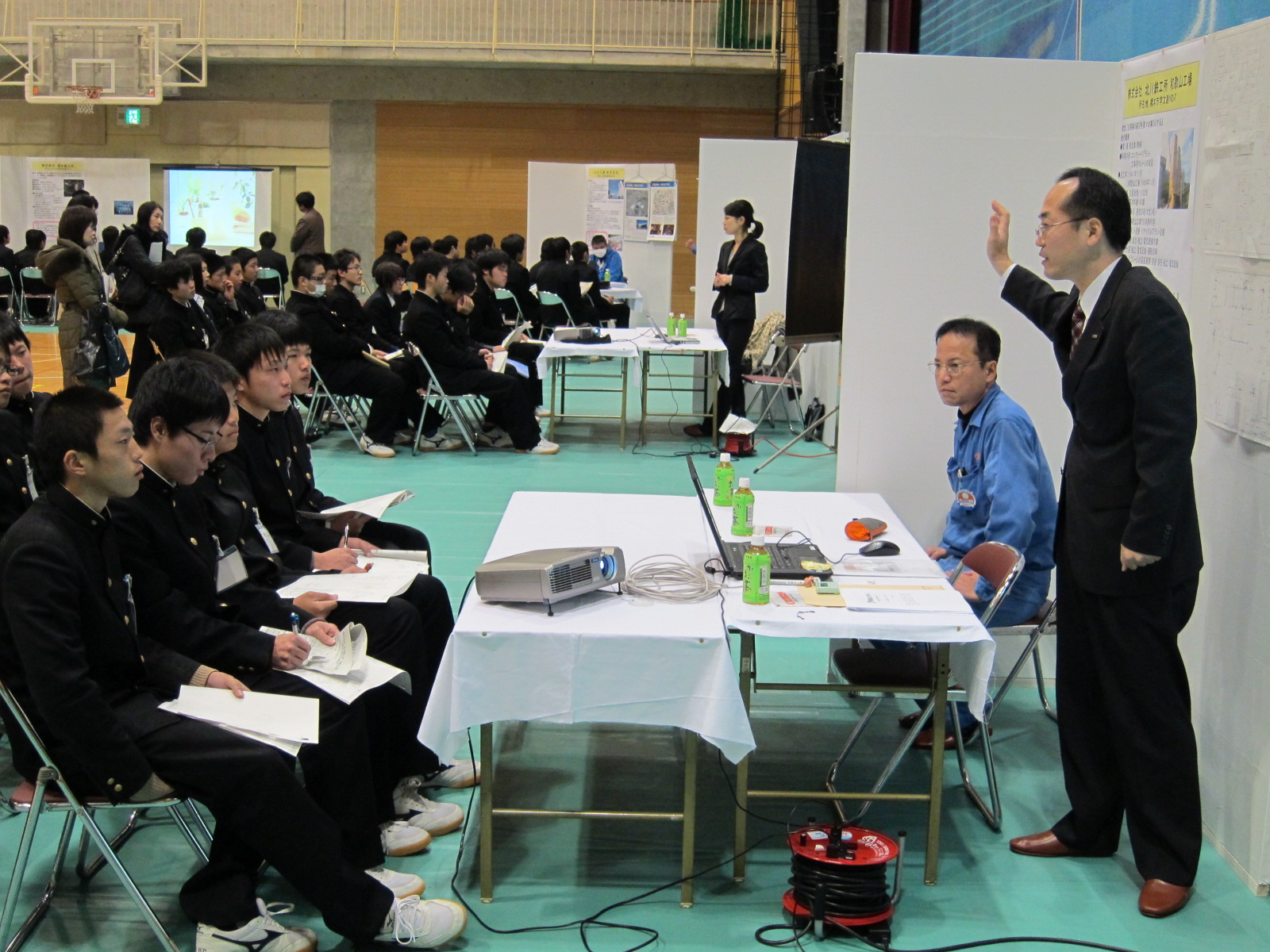 紀北工業高校体育館において企業説明会が開催されました。各企業から生徒に対し、会社の概要や業務内容などについて説明がありました。