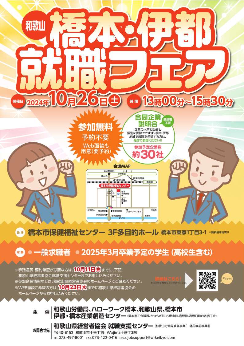 | 主催 | 和歌山労働局、ハローワーク橋本、和歌山県、橋本市、伊都・橋本産業創造センター(橋本商工会議所、かつらぎ町、九度山町、高野町、高野口町の各商工会) |